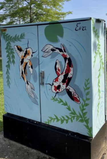 For 2024, the theme was “Unity and Peace.” Raksha Soni’s mural at Rt. 30 and Rice Rd. symbolizes spiritual peace among community members. Eva Chausse, a current sophomore at WHS, painted koi fish and a lotus blossom as a representation of communal peace on the box near Cochituate Fields at Pemberton Rd. and West Plain St.
