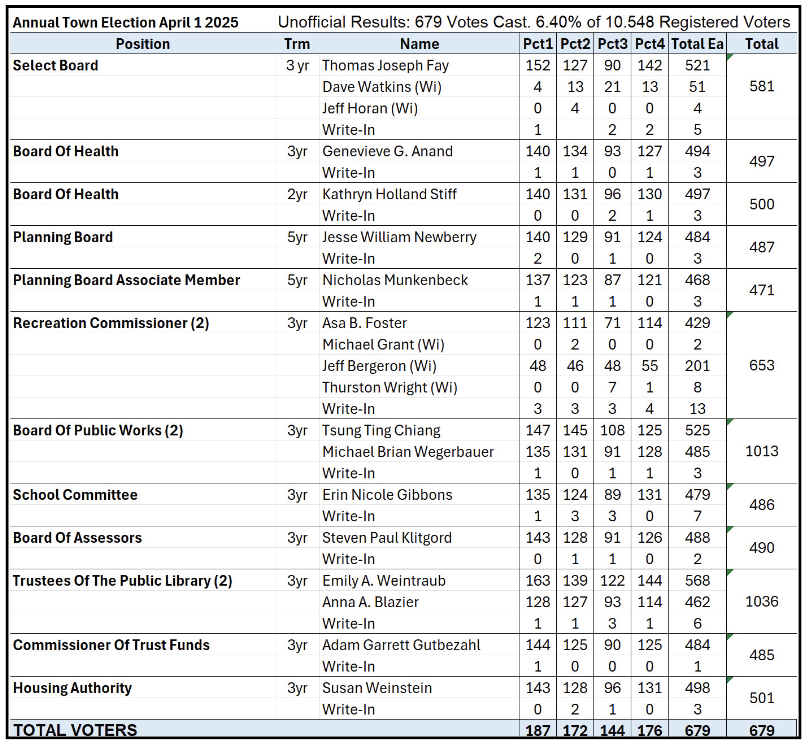 No surprises at this year’s election which was held on April 1st since all the offices on the ballot were uncontested. All the Wayland candidates who ran were elected. Wayland is not atypical. This is part of a growing trend across the country, according to Ballotpedia.org. On average, 58% of elections were uncontested between 2018 and 2023 but in 2024 Ballotpedia stated 70% of the elections were uncontested. On November 5, 2024 Ballotpedia covered 40,646 elections in 50 states, including D.C. Their study covered all levels of government excluding the presidency.