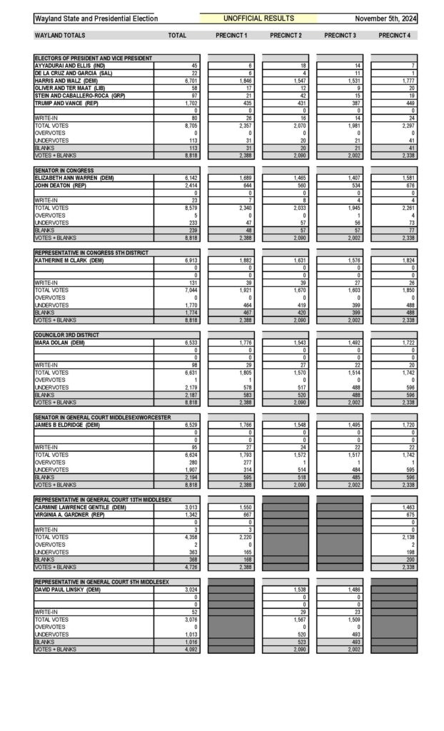The complete, still unofficial, Wayland vote tallies from Nov. 5 can be seen here in separate tables.