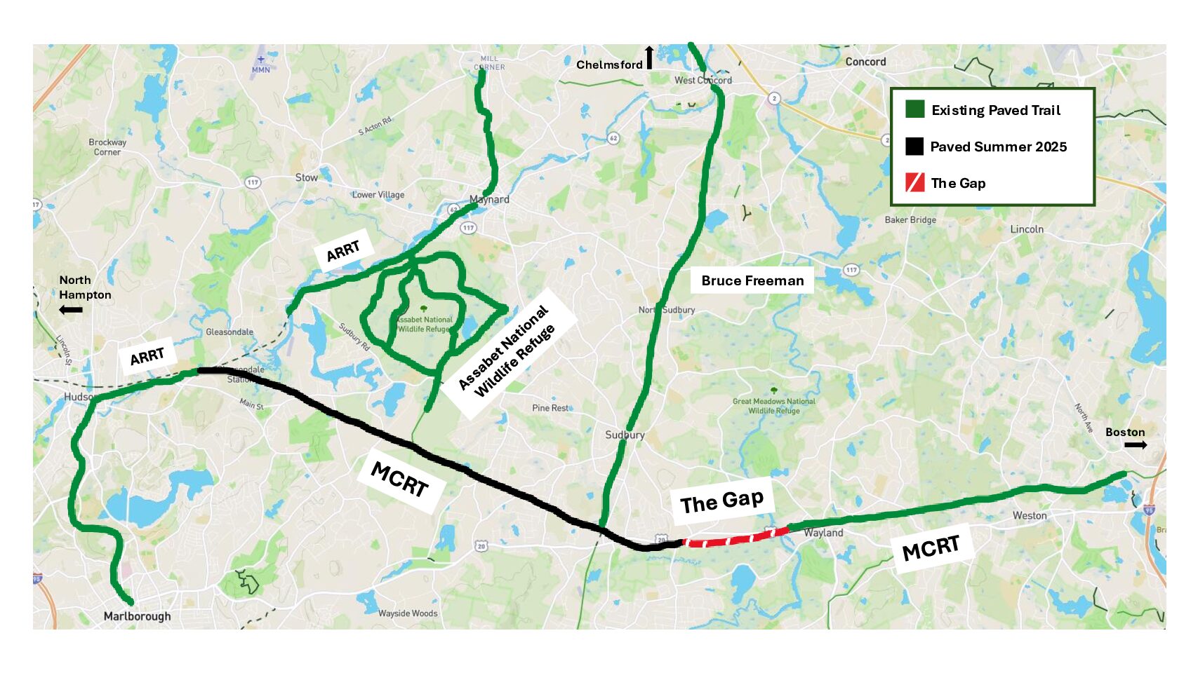 But for residents of Wayland, there’s still a missing piece. While many people enjoy the MCRT section from the Weston town line to Russell’s Garden Center, there’s currently no direct connection between the MCRT in Wayland and Sudbury. That’s because a short but crucial stretch — “The Gap”— has yet to be constructed. This one and a half mile segment would extend the trail over the Sudbury River and through the Great Meadows Wildlife Refuge, ending near Landham Road.