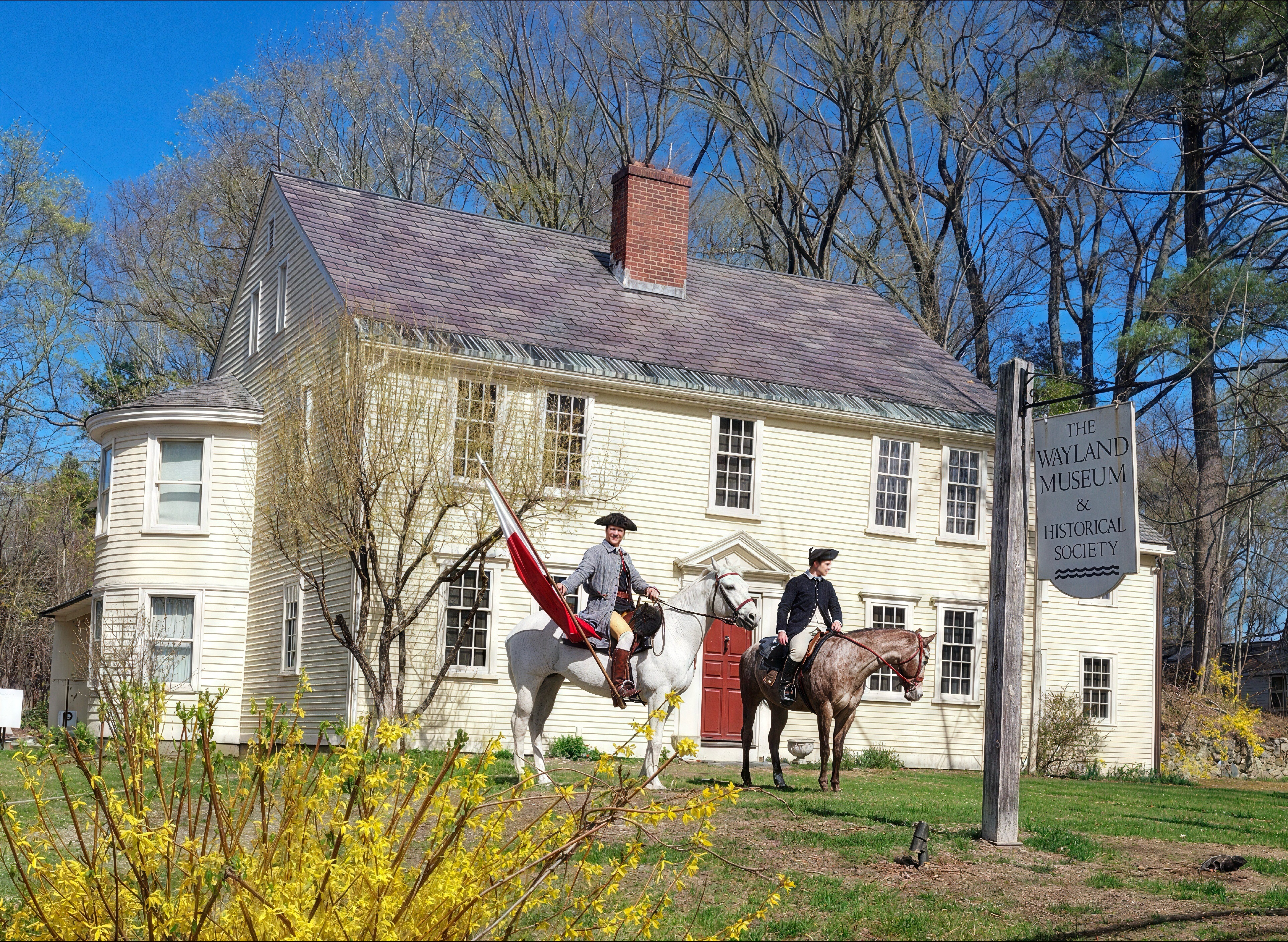 Approximately 30 residents watched the Sudbury Companies Militia and Minute march and ride through Wayland early afternoon on April 20. The Militia dressed in period costumes started at the First Parish Church (Wayland Center) stopping for commemorative salutes at Grout-Heard House and North Cemetery and ended with a salute at the Olde East Company Training Field. Then, the company headed to Old Sudbury Center.