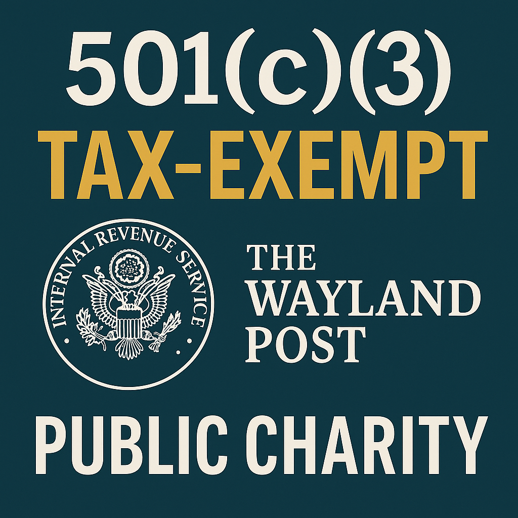 The Wayland Post has received official recognition from the Internal Revenue Service as a tax-exempt public charity under Section 501(c)(3) of the Internal Revenue Code. This milestone confirms what our readers already know: the Post is more than a trusted source of local journalism — it’s a nonprofit institution built on community support.
